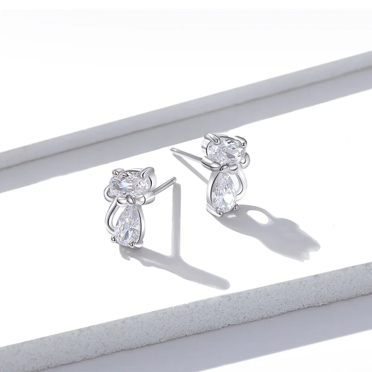 Cat Silver Stud Earrings Sterling Silver 925 Clear CZ Cute Animal Ohrringe Hypoallergenic Female - PeticaDeals